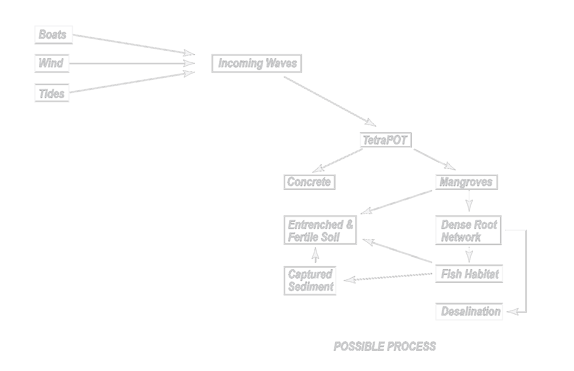This project aims to work from the idea of the Tetra-Pot, a system in which a tetrapod supports a mangrove tree to prevent erosion, and expand it into networks of those tetrapods which now support a diverse system of microclimates. These systems are augmented by funnels of various types, and use their relationships with water to form specific climates for flying, walking, climbing, and swimming creatures. The diverse set of microclimates allow for interaction between the creatures on the bridge and the island, shoreline, and river.